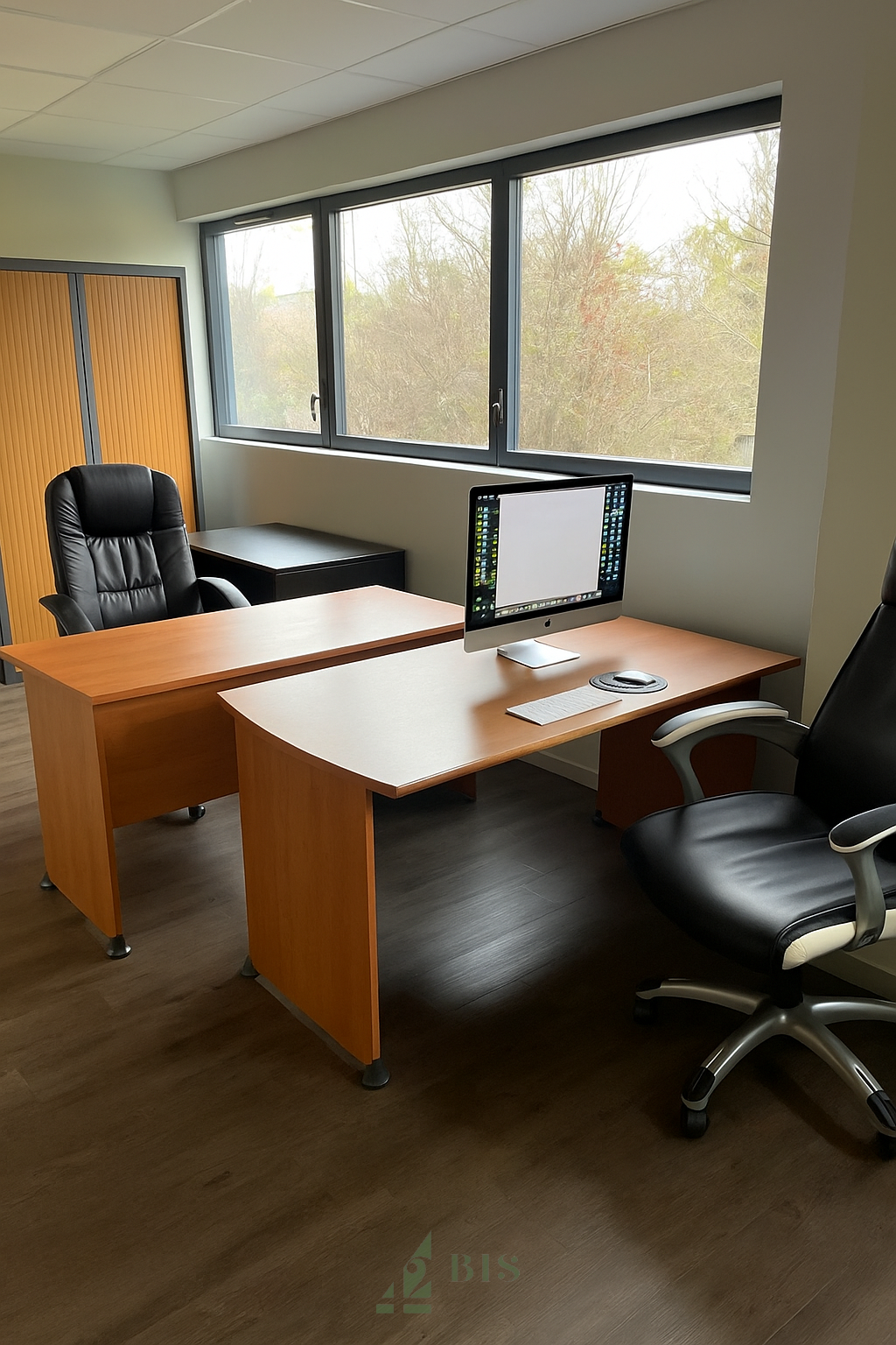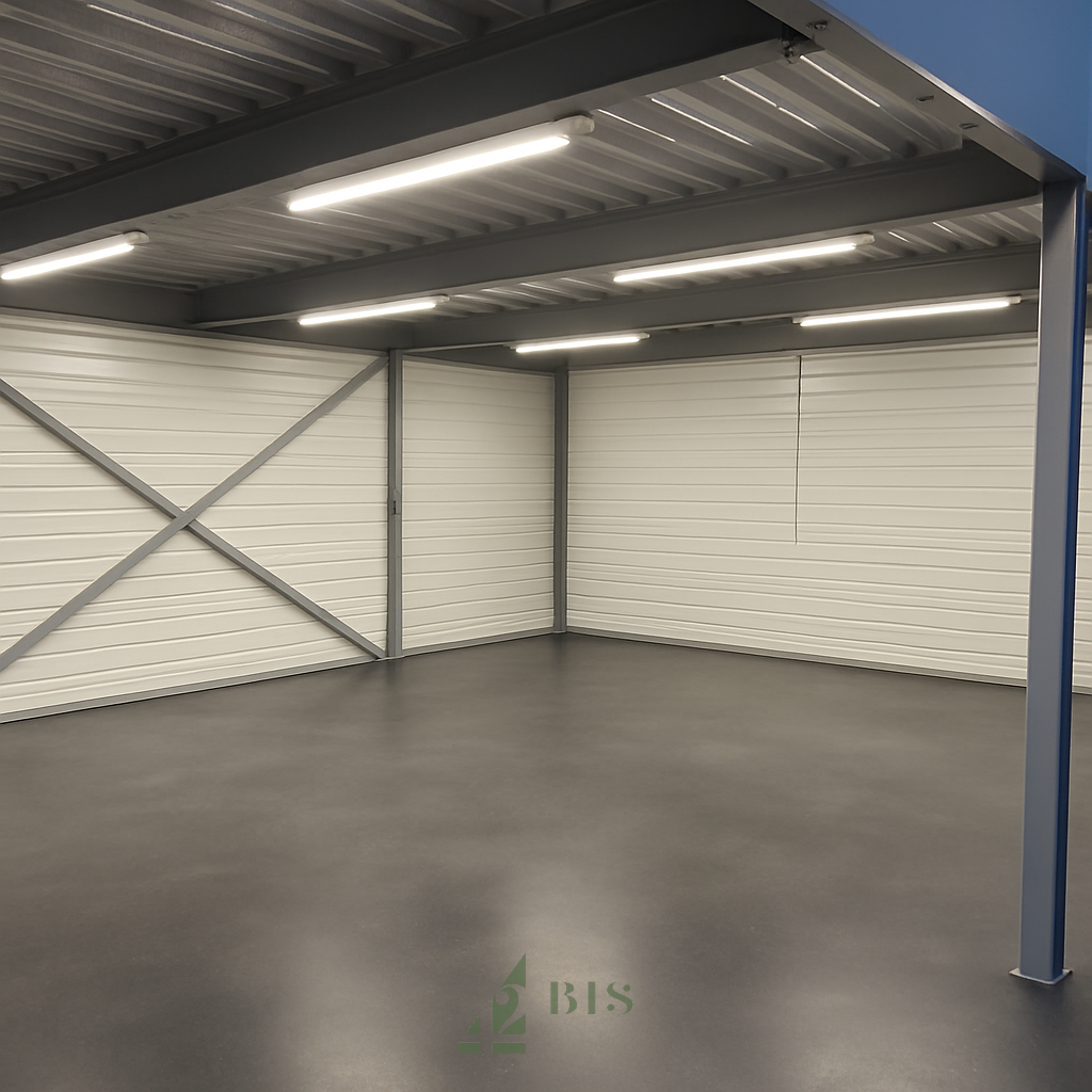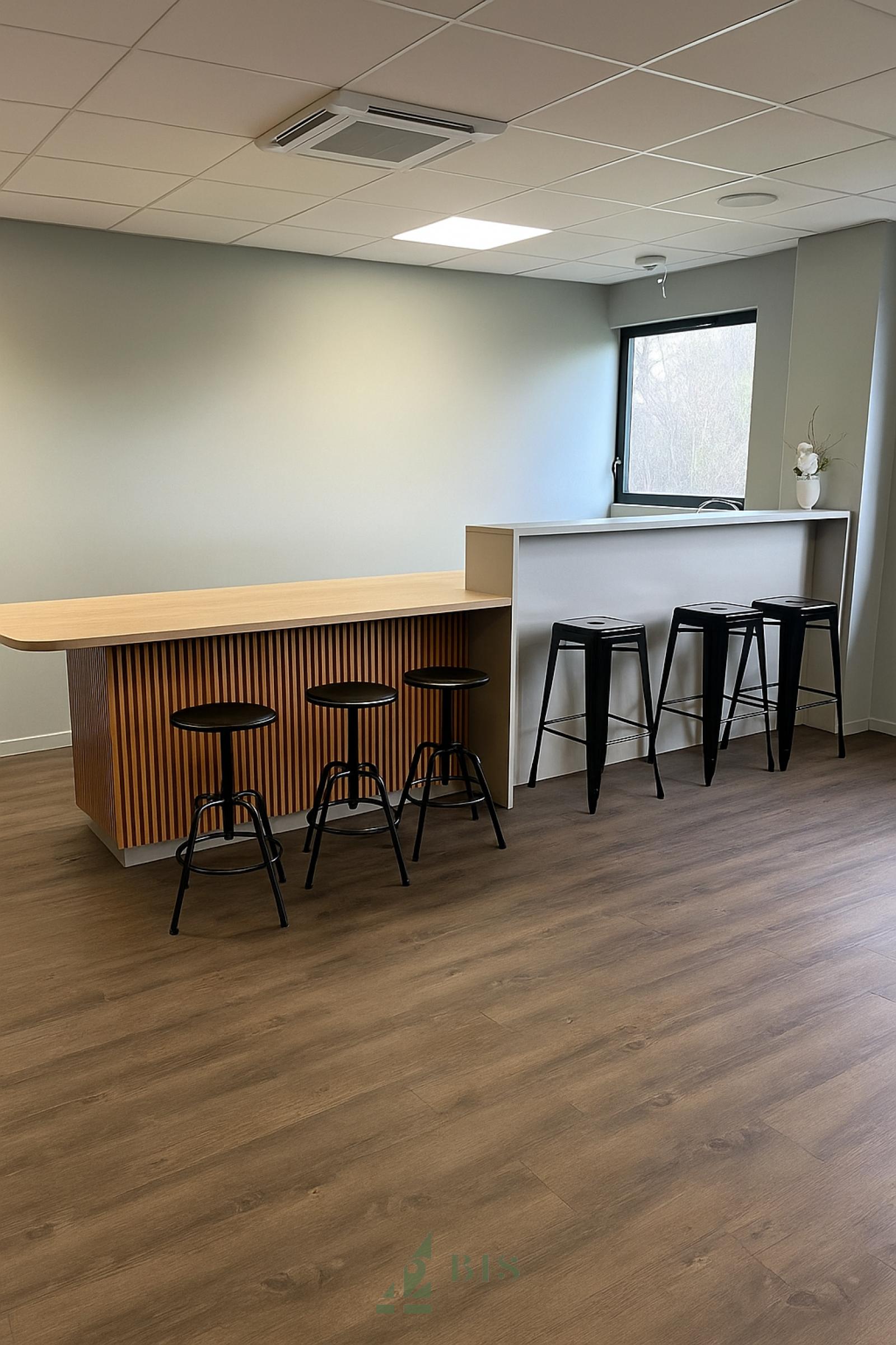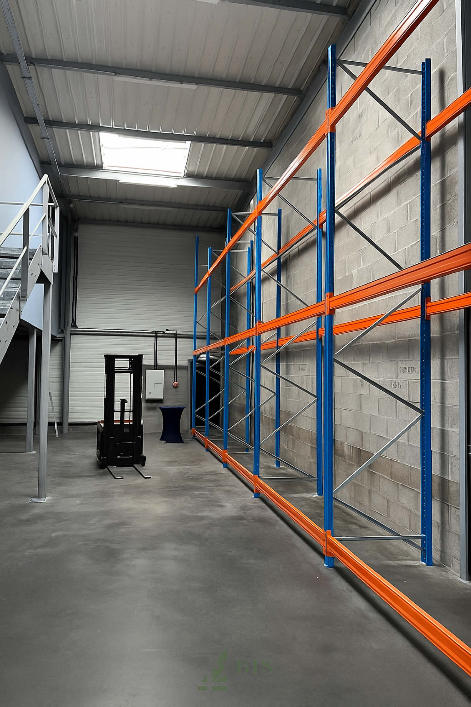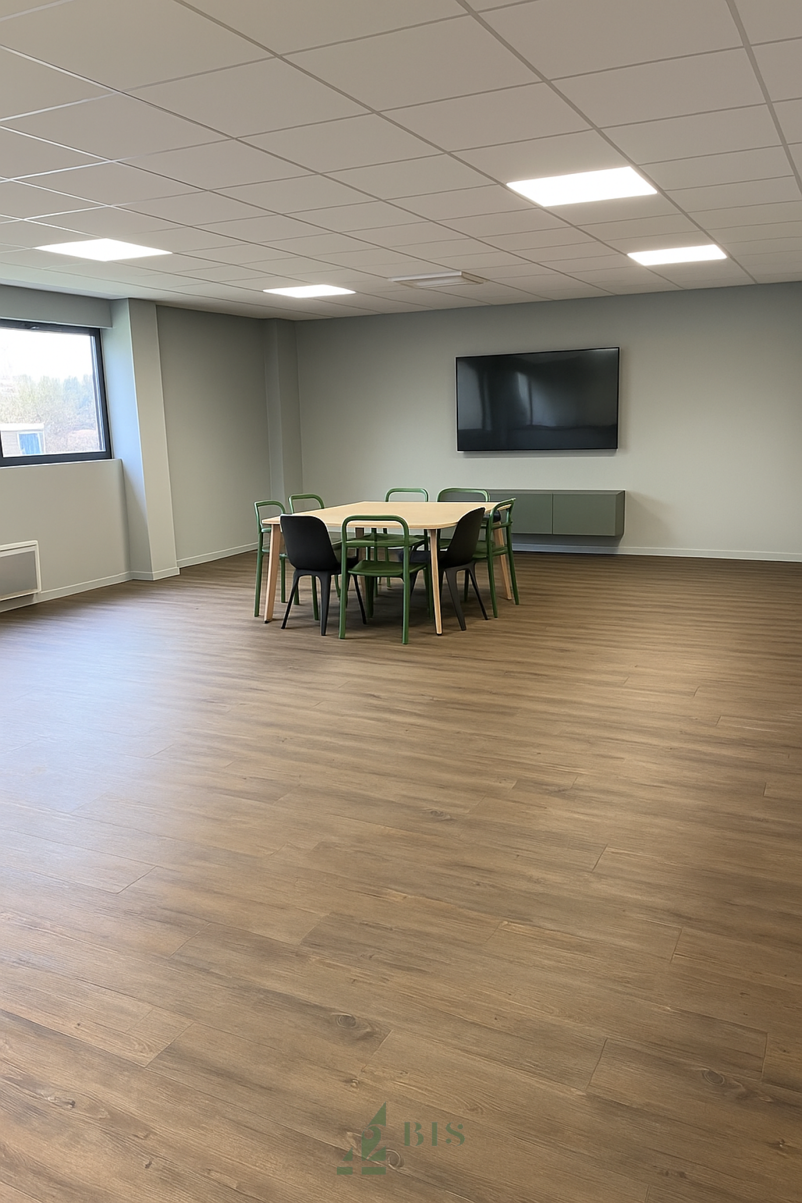 Une mezzanine de 124 m² à usage de bureaux avec un open space, trois bureaux, une grande salle de réunion avec un espace kitchenette, sanitaire.
