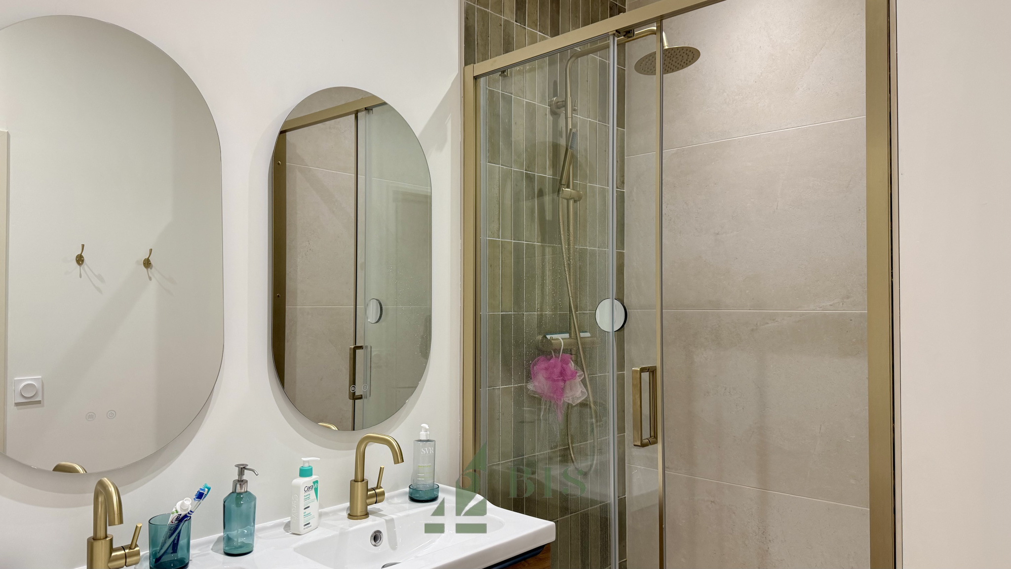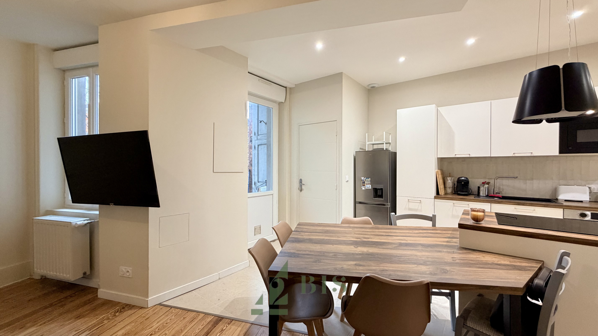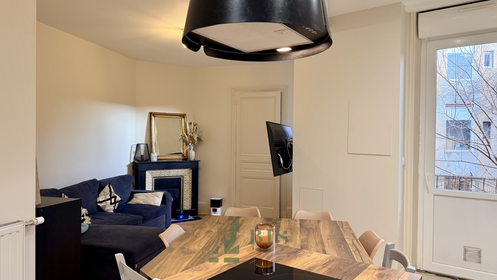 Situé au premier étage et rénové en 2025, ce bien offre une pièce de vie avec cuisine ouverte, une belle hauteur sous plafond, un joli parquet d'origine et de belles cheminées. Par la suite on retrouve deux chambres, ainsi qu'une salle d'eau et un WC séparé.